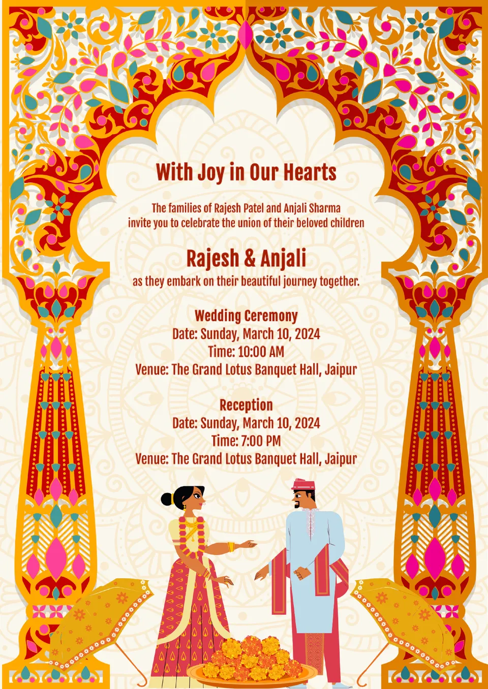 Looking to create a stunning invitation that reflects the rich traditions of an Indian wedding? The Wedding Indian Invitation Template offers vibrant designs and intricate patterns that capture the spirit of your celebration. With customizable sections, you can easily add essential details like venue, timings, and RSVP information. Perfect for traditional ceremonies or modern celebrations, this template ensures your invitations honor the beauty and elegance of Indian culture.