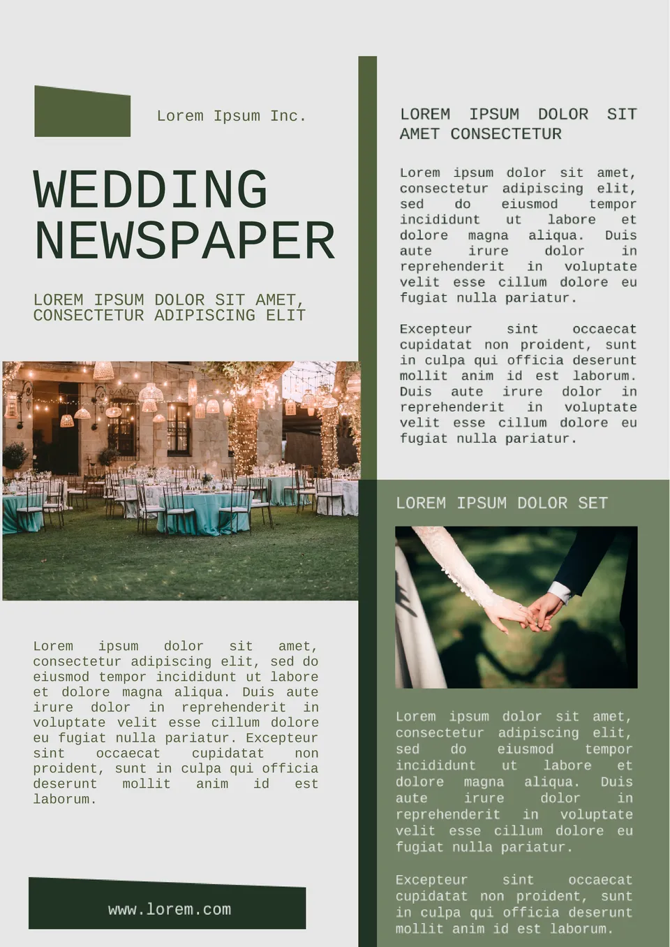 With this elegant layout, you can tell your wedding guests the love story of the newlyweds, describe the ceremony plan, and even design original invitations. It will come in handy for both individuals and event agencies preparing for a solemn event. Visually, the newspaper template is divided into two columns, each of which has a place for a photo. The green color scheme can be easily changed in the editing process if desired.