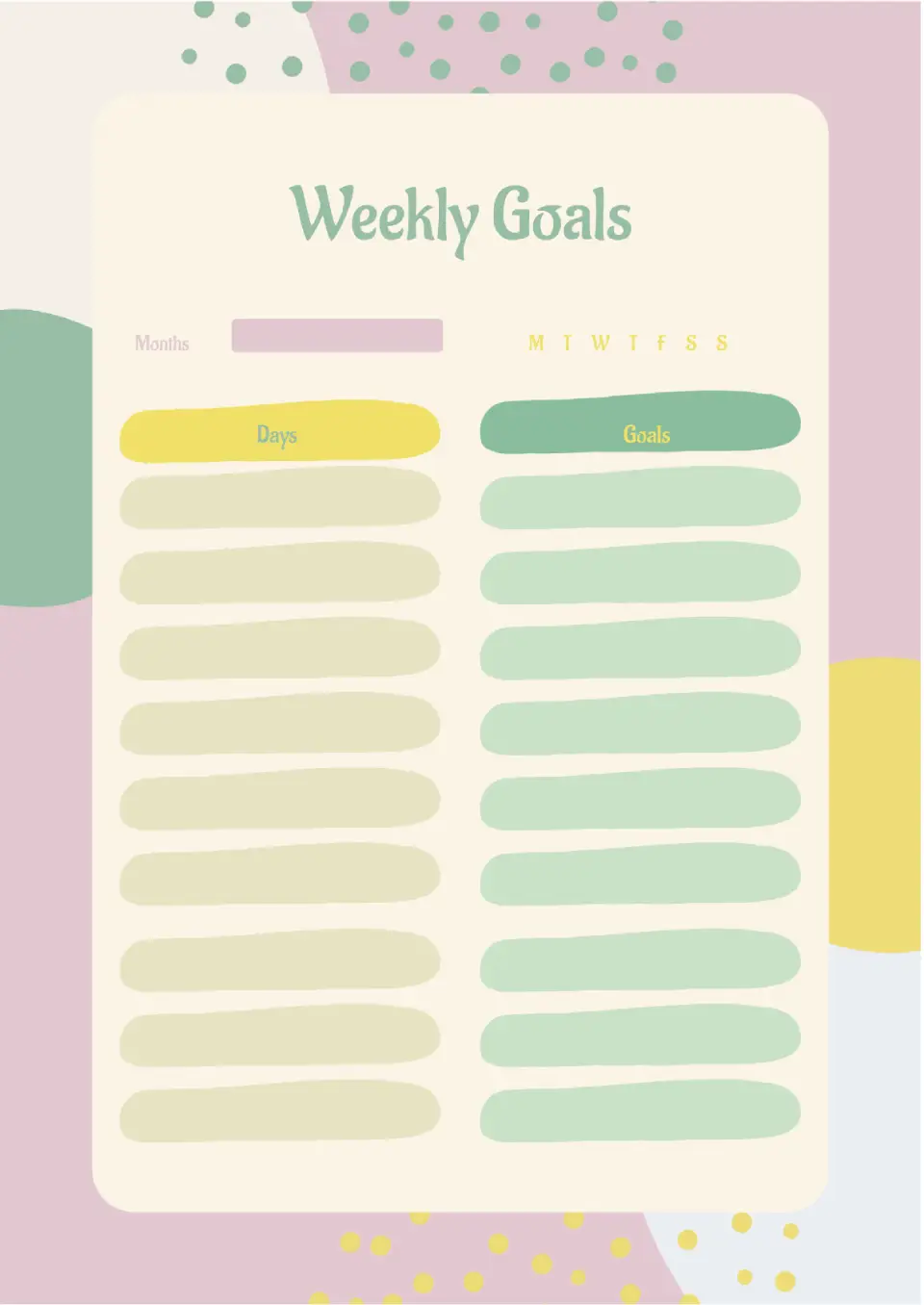 The layout has a simple structure: dates are written in the left column and goals in the right column. Each column consists of nine blocks of text, which is enough for planning weekly goals. The bright colors of the Google Docs goals templates are harmoniously combined with each other, but you can change the shades during the editing process if you wish.