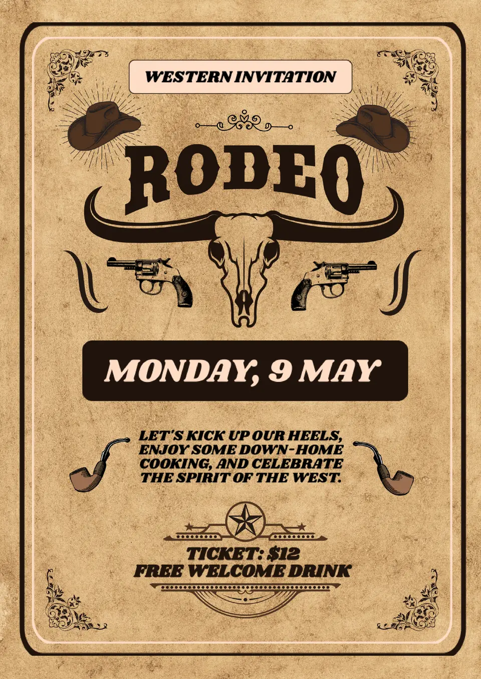 Want to bring a touch of the Wild West to your event? The Western Invitation Template features a rustic design, perfect for cowboy-themed parties, rodeos, or barn dances. Customize the event details with date, location, and attire to ensure your guests are ready to saddle up for a fun-filled event.