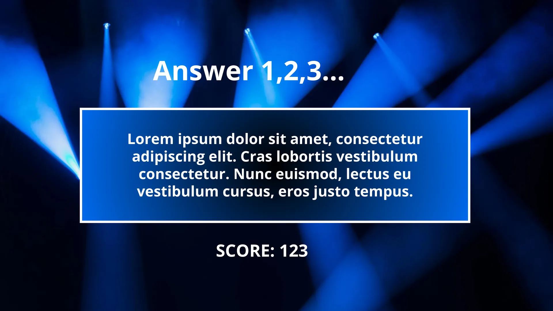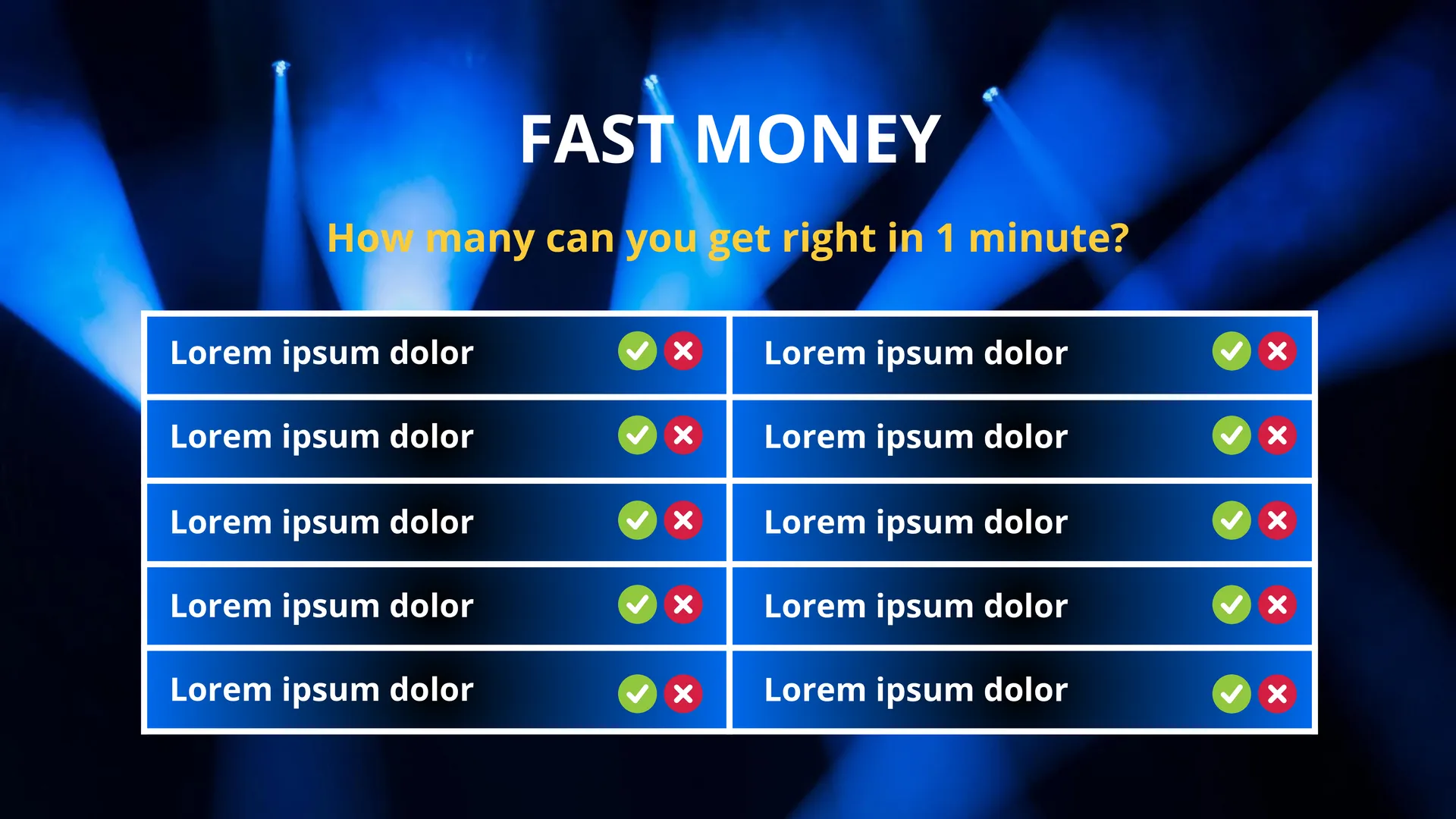 Create an unforgettable gaming session with this unusual template. Its design successfully combines a modern black background with images of spotlights and classic Family Feud mechanics. The layout can be easily adapted to any game theme. There are no restrictions on the audience either: this Google Slides template is perfect for parties, family gatherings, and corporate events. The last slide is designed for the Fast Money round, so that players continue to compete until the final.