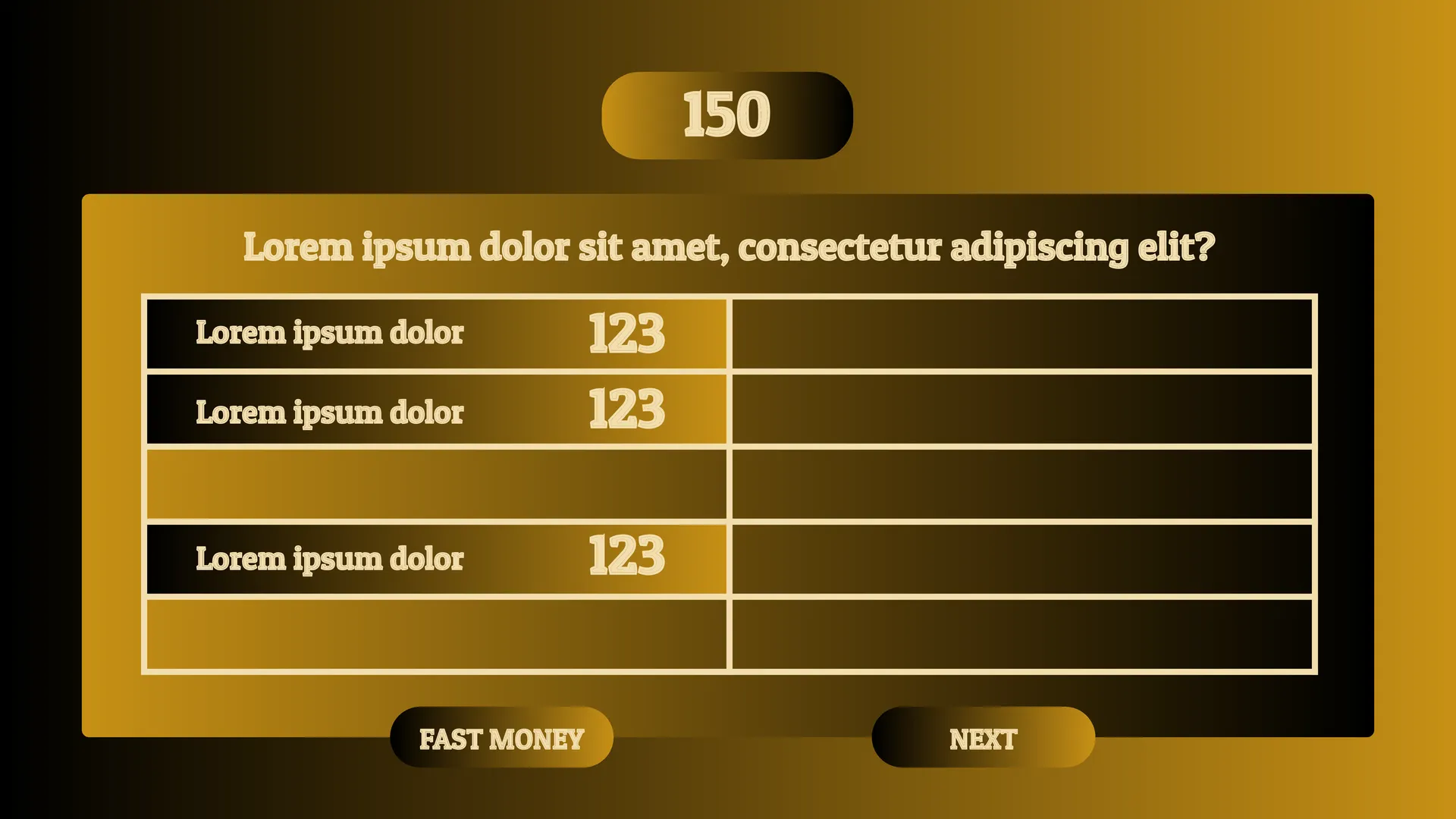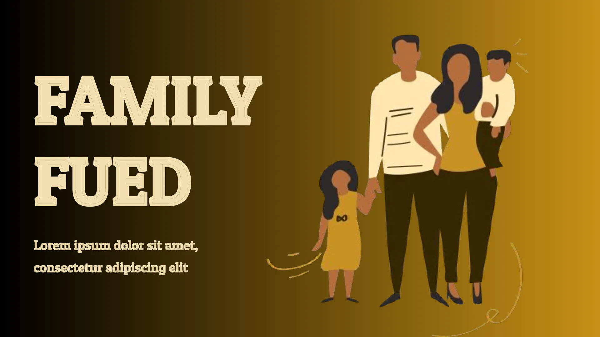 The original Family Feud Survey Questions Template for Google Slides has an unusual design. The dark golden color palette looks stylish and elegant, which will make a pleasant impression on the players. Although the first slide has a beautiful image of a family with children, the layout is suitable not only for organizing a competition between families. This free family feud template can also be used to create a game between friends, colleagues, classmates.