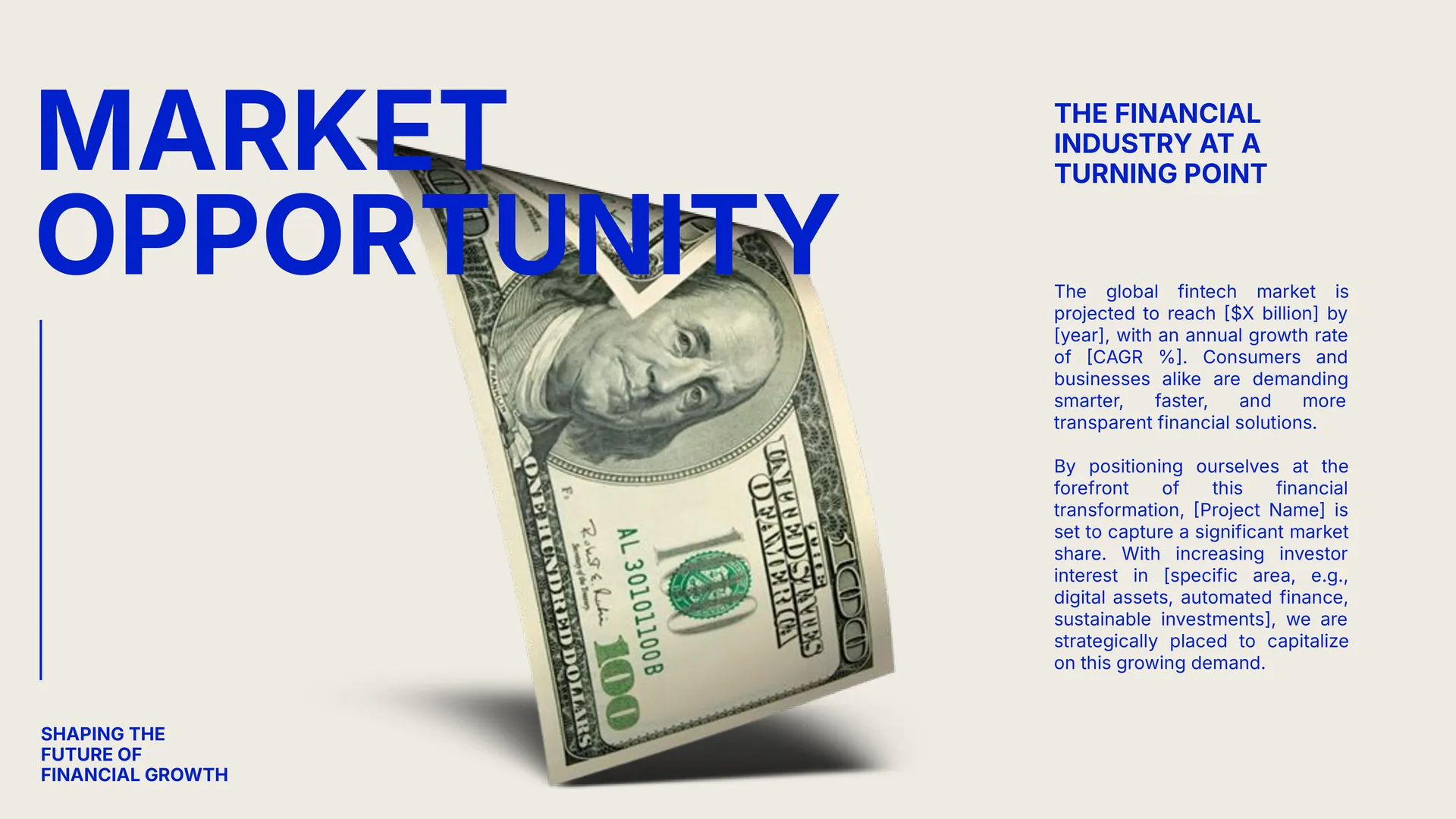 Securing funding in the financial sector demands a pitch deck that exudes professionalism and clarity. Our Financial Pitch Deck Template is tailored to assist financial startups and businesses in presenting their proposals convincingly. The template encompasses slides for market opportunity, financial products or services, revenue models, competitive analysis, and financial forecasts. Its clean and structured design ensures that complex financial information is communicated transparently and effectively. Customizable features enable you to adapt the presentation to your brand aesthetics and specific objectives. By utilizing this template, you can enhance your pitch, making it more persuasive to investors and stakeholders.