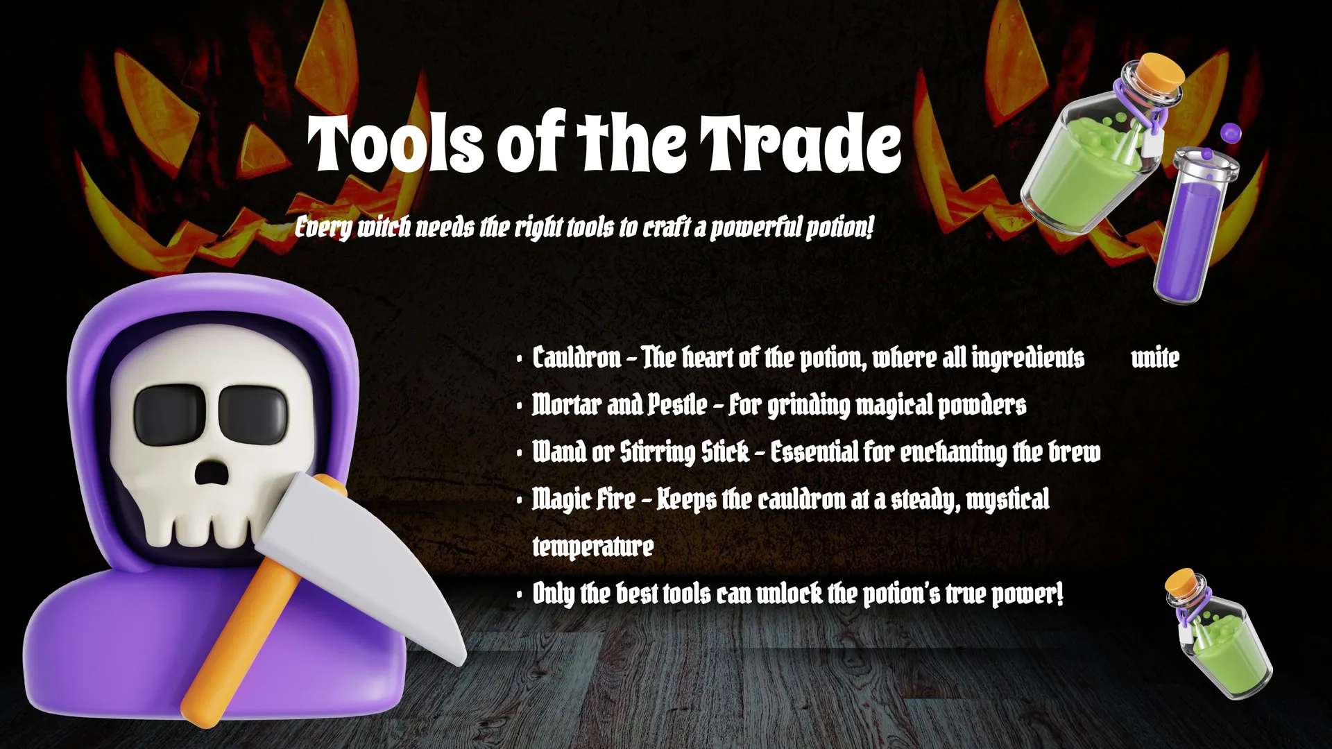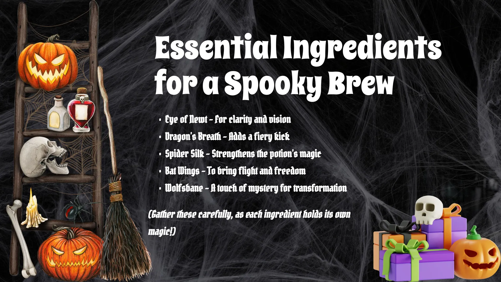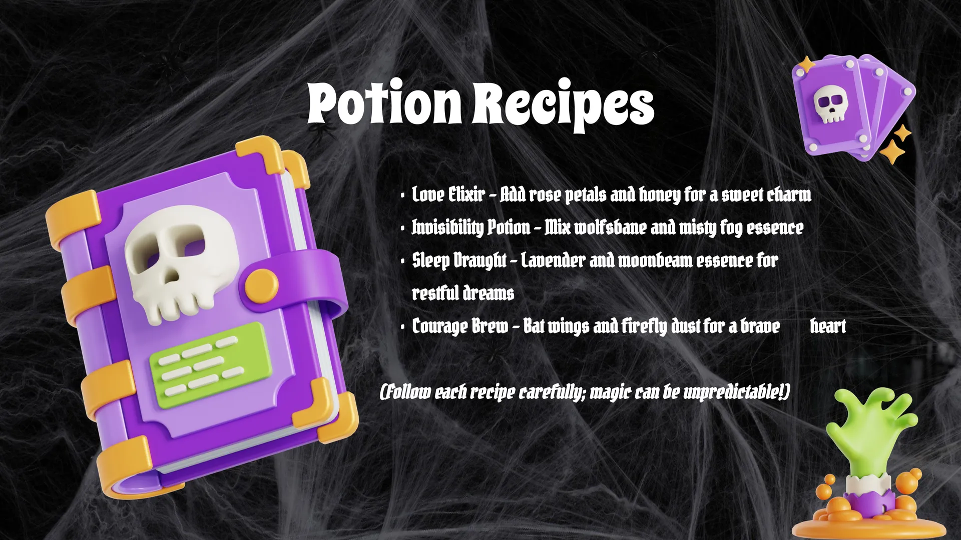 Delve into the mystical world of witchcraft with our Halloween Witch's Potion Presentation Template. Designed with enchanting visuals and a magical theme, this template is perfect for presentations about potion recipes, magical history, or any witch-related topics. The slides feature cauldron graphics, mystical symbols, and a dark, moody color palette that brings the theme to life. Each slide is thoughtfully crafted to balance visual appeal with ample space for your content, ensuring your message is both clear and captivating. By utilizing this template, you can transport your audience into a world of magic and mystery, making your presentation both informative and enchanting.