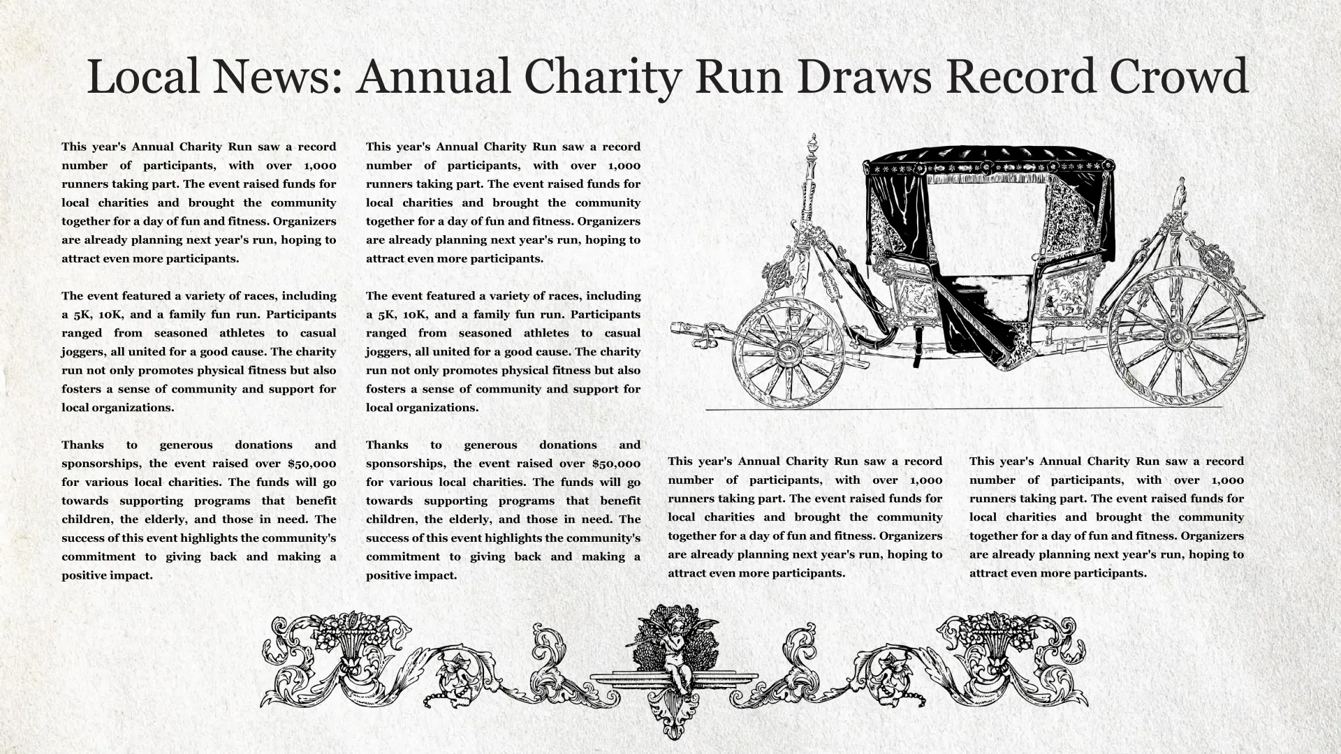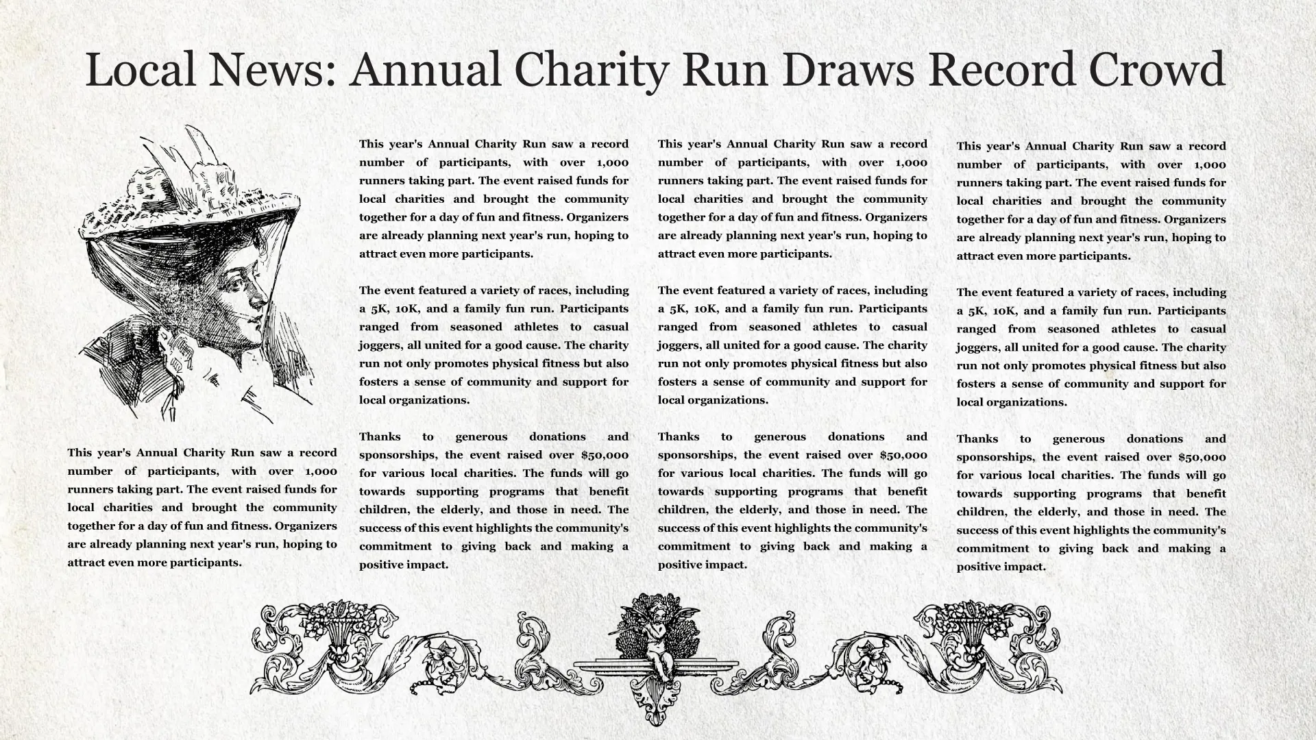Create a timeless and classic presentation with the Vintage Newspaper Template for Google Slides. This template offers an elegant, retro look perfect for showcasing historical information, creative projects, or themed events.