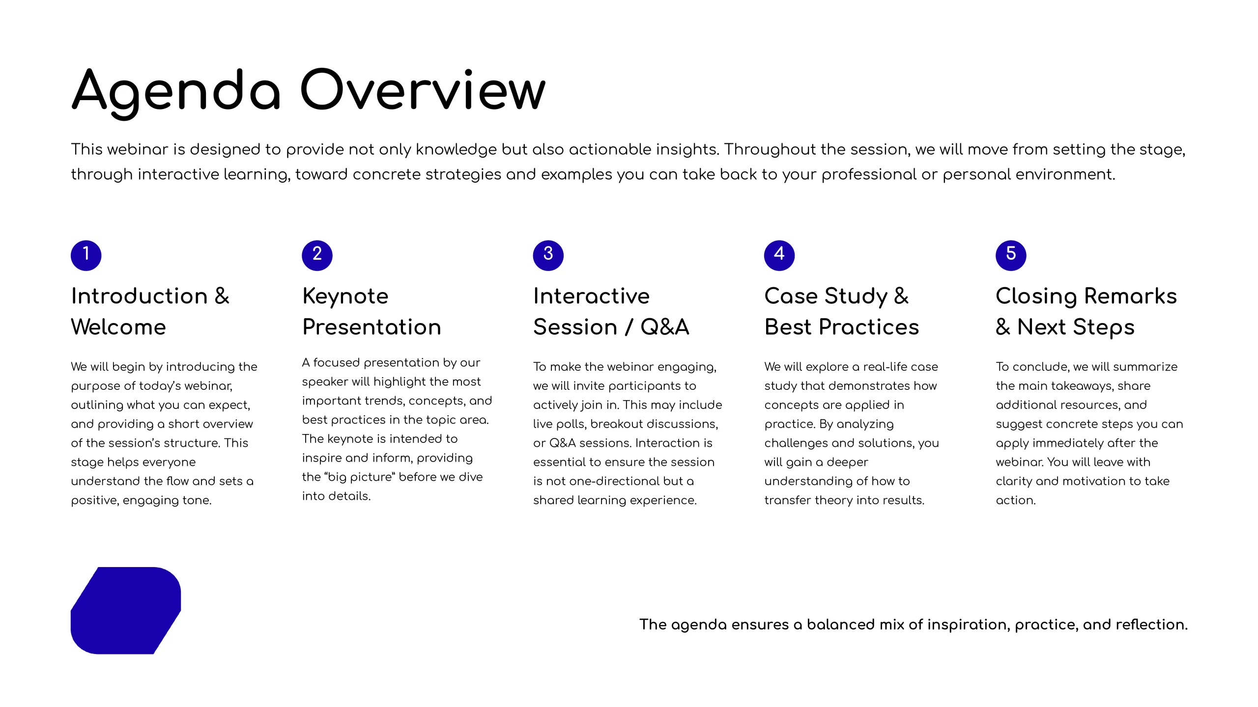 Want to run webinars that keep attendees engaged from start to finish? The Webinar Agenda Template helps you structure every session with clear timelines, topics, and speaker details. Fully customizable layouts make it easy to match your branding and highlight key points. Perfect for online events, training sessions, and presentations, it saves time while keeping everything professional. Ensure your audience stays focused and leaves with value.